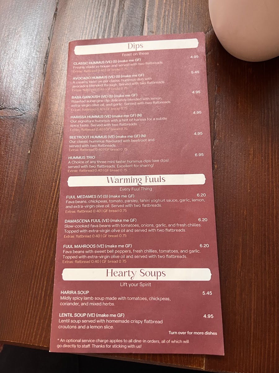 Crisp falafel balls, choice of dip (see dips), choice of fuul, (see fuuls), juz-muz, served with bread. Extras: flatbread 15p | GF bread 65p